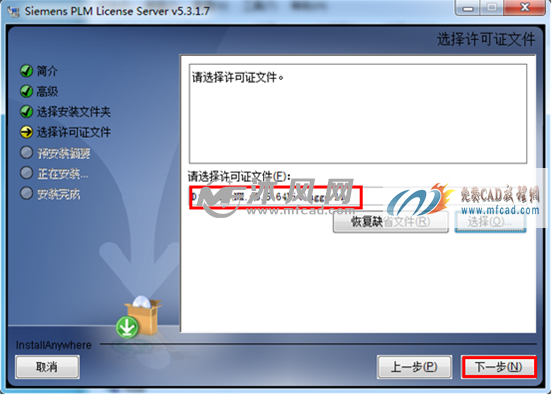 [size=0.7]选择我们刚才放置到D盘修改好的许可证文件路径,然后选择下一步,如图: