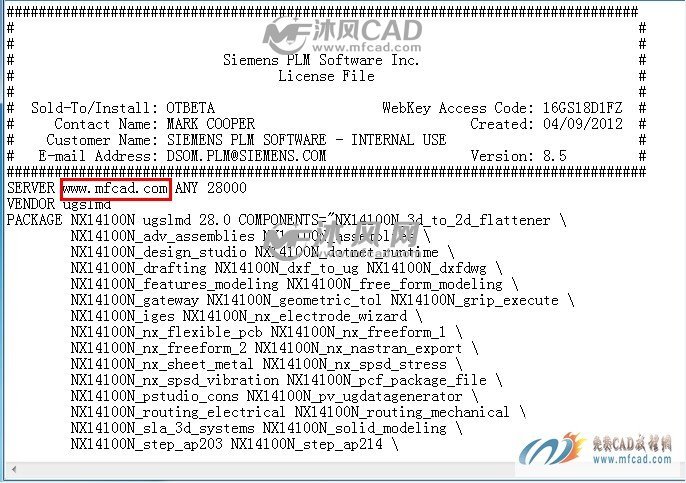 [size=0.7]首先以记事本的格式打开破解文件中的许可证文件,打开文件之后要用自己的电脑计算机的名称修改,下面红色方框中的“www.mfcad.com”,如图: